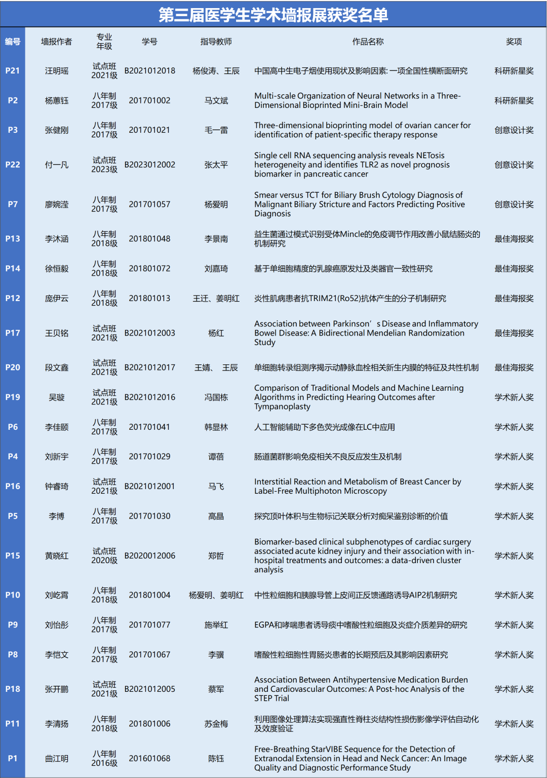 此次学生学术墙报展面向北京协和医学院临床医学专业八年制和临床医学专业试点班全体在校生,通过学生自愿报名、作品征集、专家初审、形式审核等程序,最终遴选出22份作品。通过线上票选、现场展出和专家评审等多个环节,对参展的墙报进行综合评比。